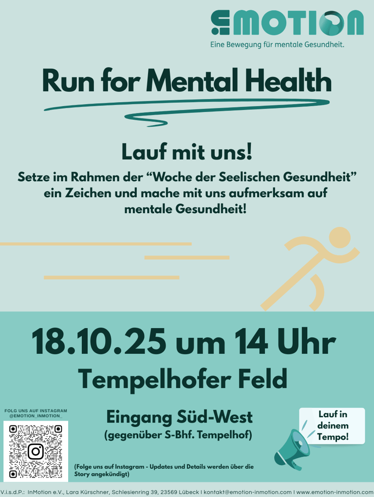 Am 18.10.25 um 14 Uhr laufen wir gemeinsam auf dem Tempelhofer Feld in Berlin 🏃♀️🏃♂️ – für mehr Sichtbarkeit und Bewusstsein rund um mentale Gesundheit.
